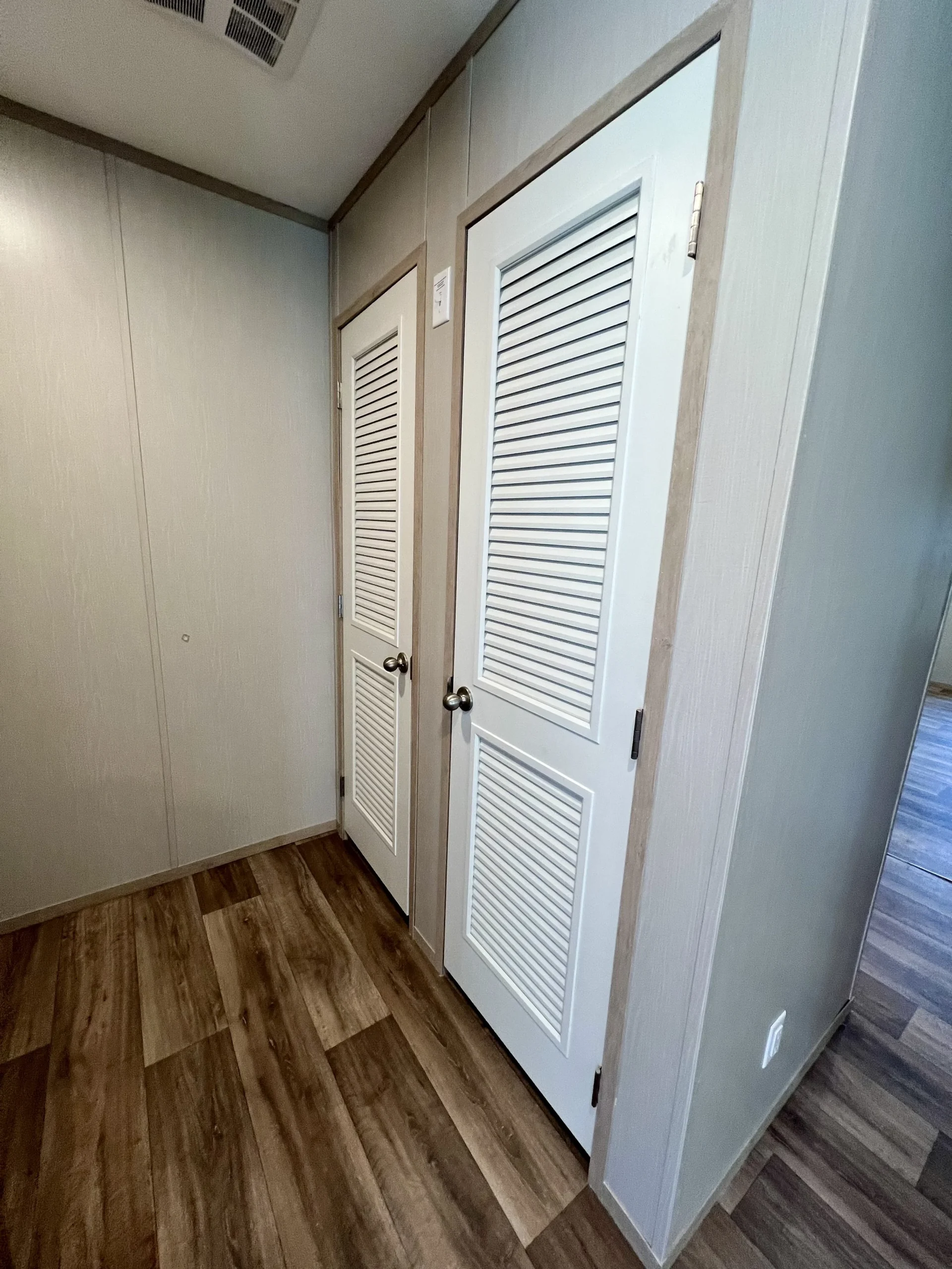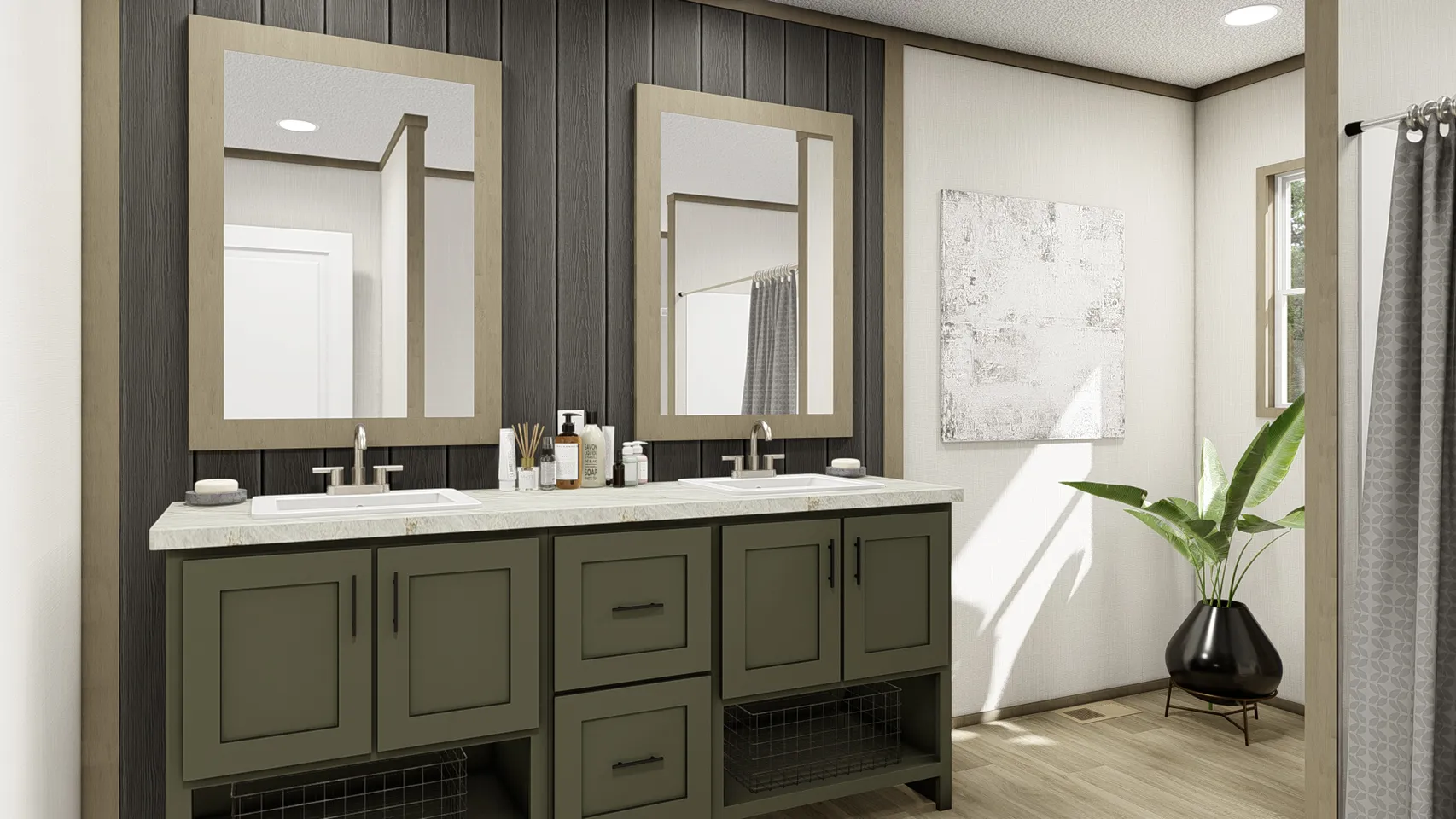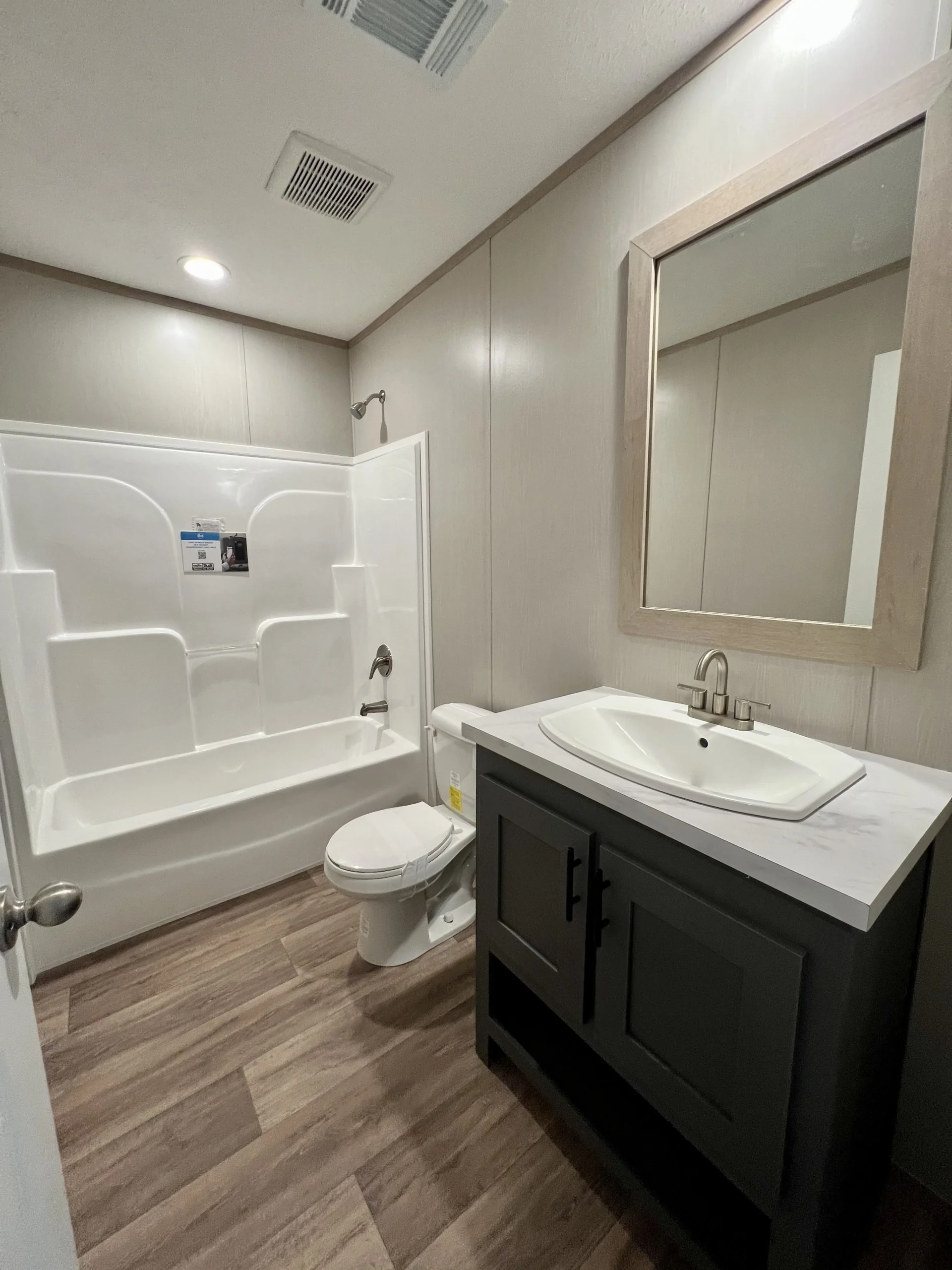 - Private Primary Suite: The primary bedroom includes an en-suite bathroom with a double sink vanity and a 42″ x 60″ one-piece fiberglass soaker tub/shower, providing a serene retreat within the home.