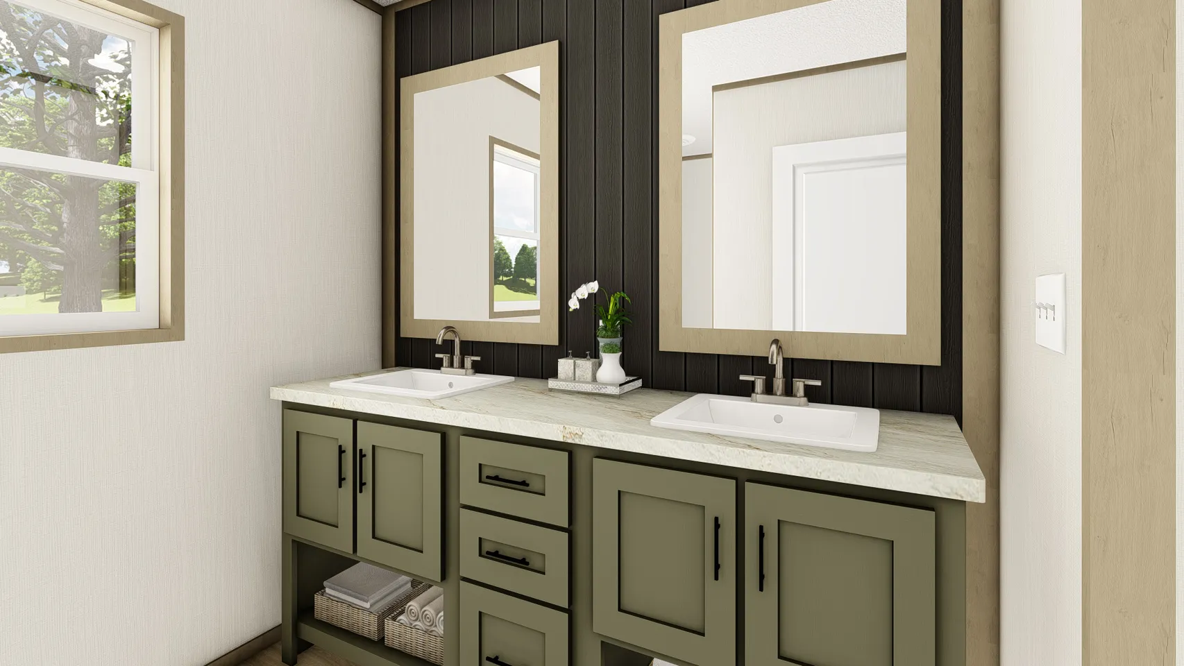 Private Master Suite: The master bedroom includes an en-suite bathroom with a double sink vanity and a 42”x60” one-piece fiberglass soaker tub/shower, providing a luxurious retreat. Design Center